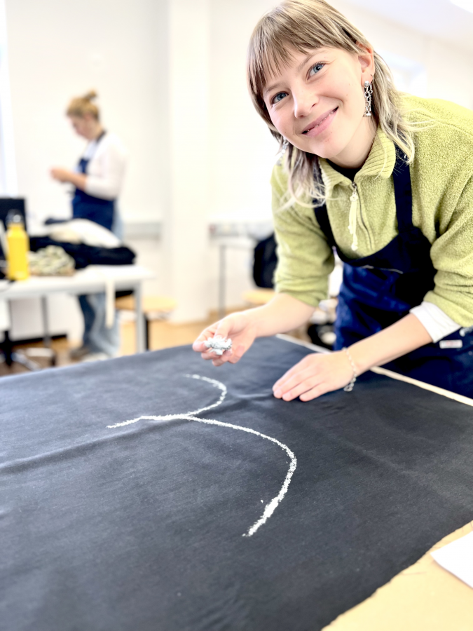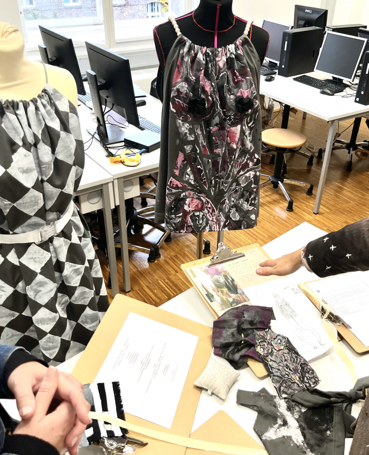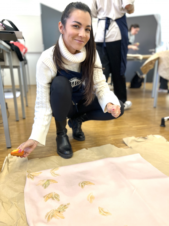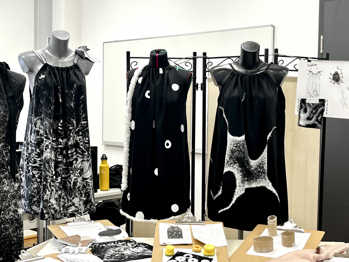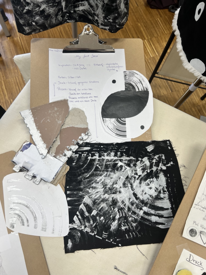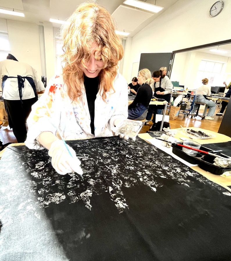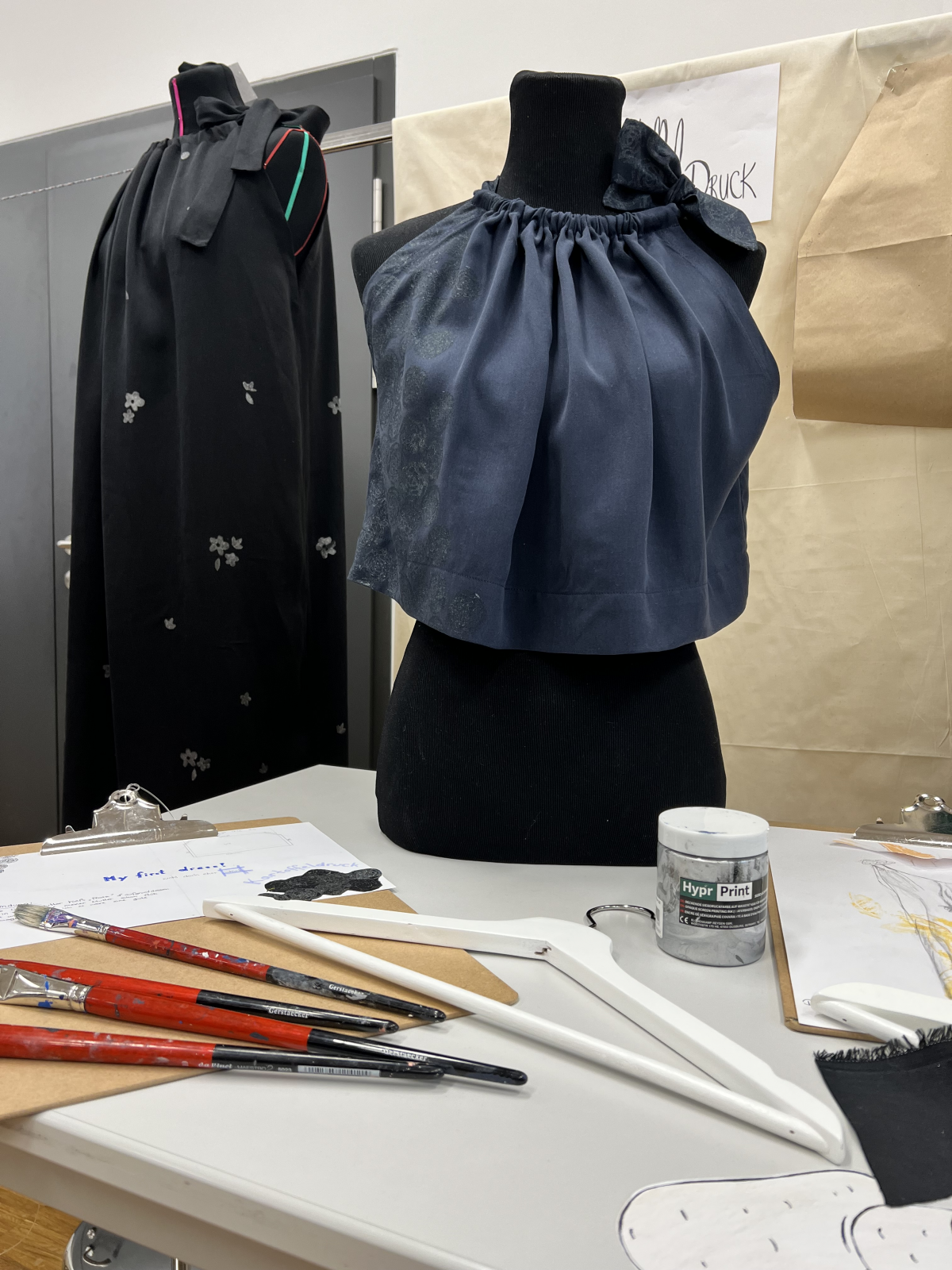 Der Ausgangspunkt war für alle gleich: Ein Schnitt für ein einfaches Kleid und ein Stück Stoff Drape Twill aus Tencel. Was daraus entstanden ist, könnte aber kaum unterschiedlicher sein. Wir gestalteten den Stoff mithilfe von Druck, Freihandzeichnen und anderen kreativen Methoden. Zu den verwendeten Drucktechniken zählen zum Beispiel: Druck mit Schwämmen, Stahlwolle, Alufolie oder Kartonrollen und Kartoffeldruck. Auch Schablonen, Malerkrepp und jede Menge Textilfarbe waren im Einsatz.