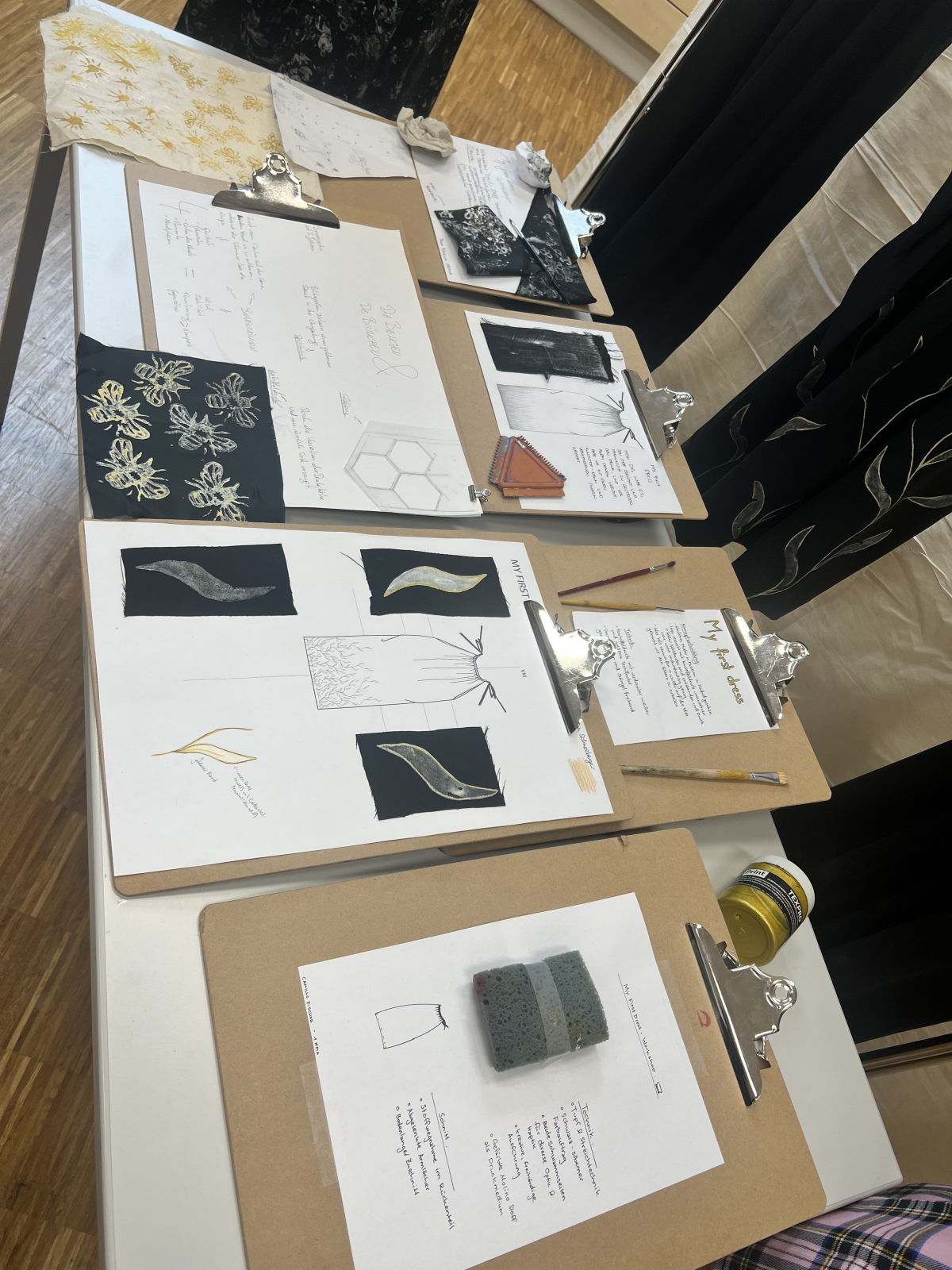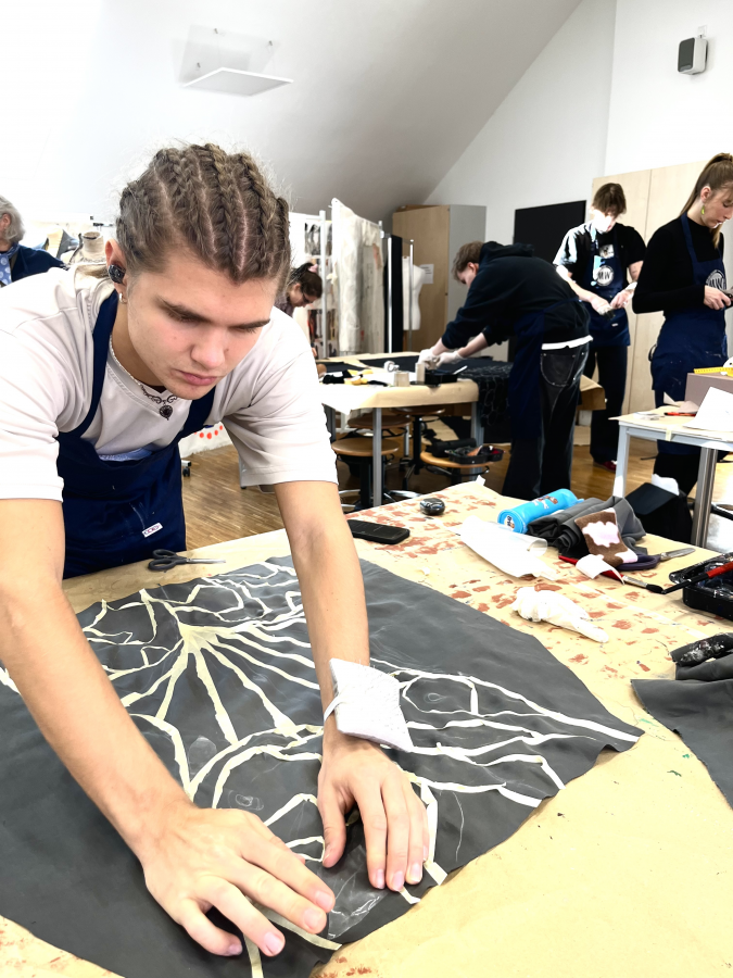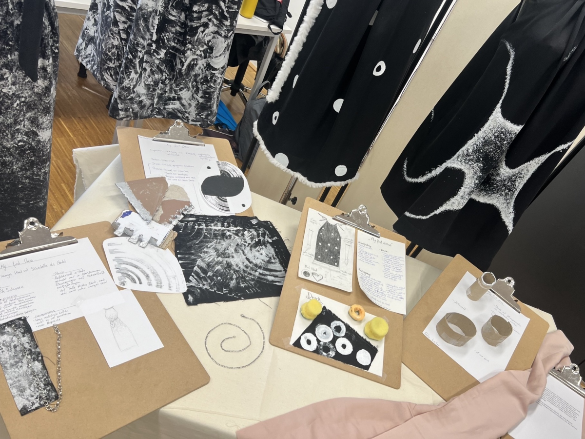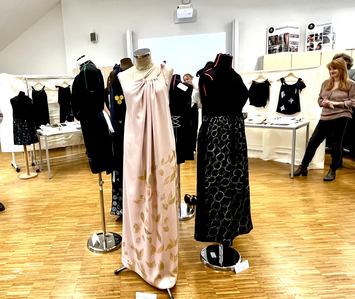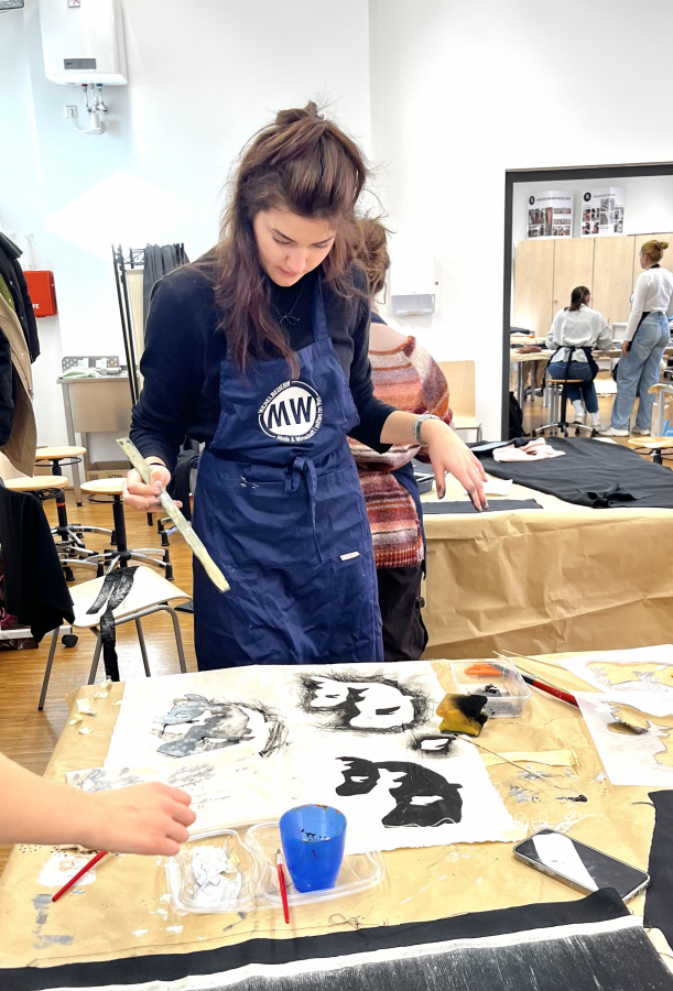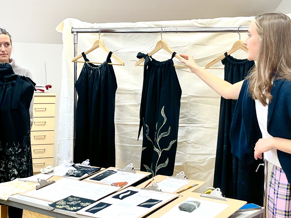 Der Ausgangspunkt war für alle gleich: Ein Schnitt für ein einfaches Kleid und ein Stück Stoff Drape Twill aus Tencel. Was daraus entstanden ist, könnte aber kaum unterschiedlicher sein. Wir gestalteten den Stoff mithilfe von Druck, Freihandzeichnen und anderen kreativen Methoden. Zu den verwendeten Drucktechniken zählen zum Beispiel: Druck mit Schwämmen, Stahlwolle, Alufolie oder Kartonrollen und Kartoffeldruck. Auch Schablonen, Malerkrepp und jede Menge Textilfarbe waren im Einsatz.