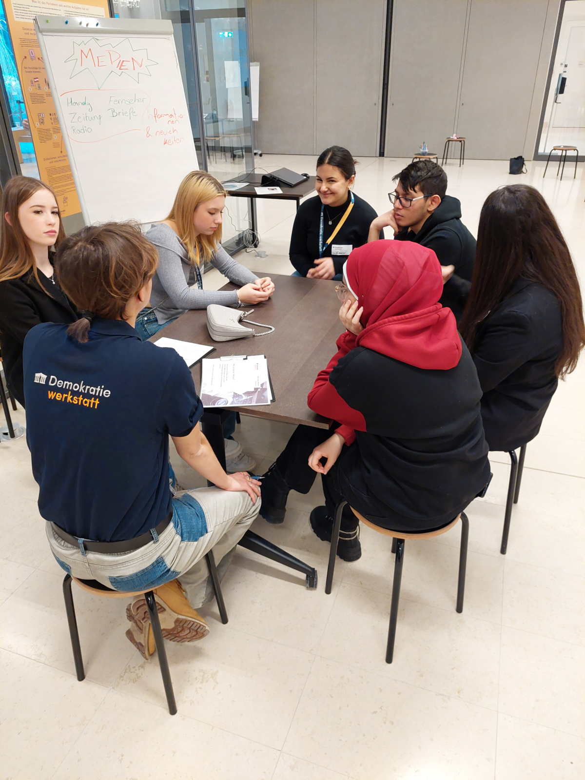 Die Jugendlichen haben im Zuge des Workshops „Medien - Wie informiere ich mich?“ in Kleingruppen einen Podcast erstellt. Zu Beginn wurden drei große Fragen beantwortet: