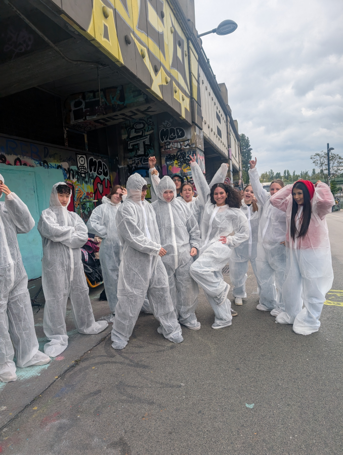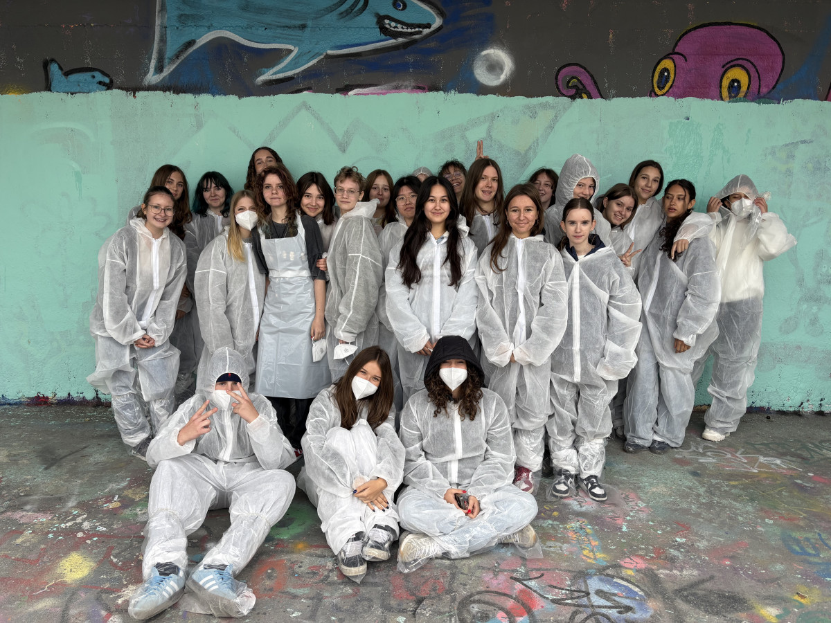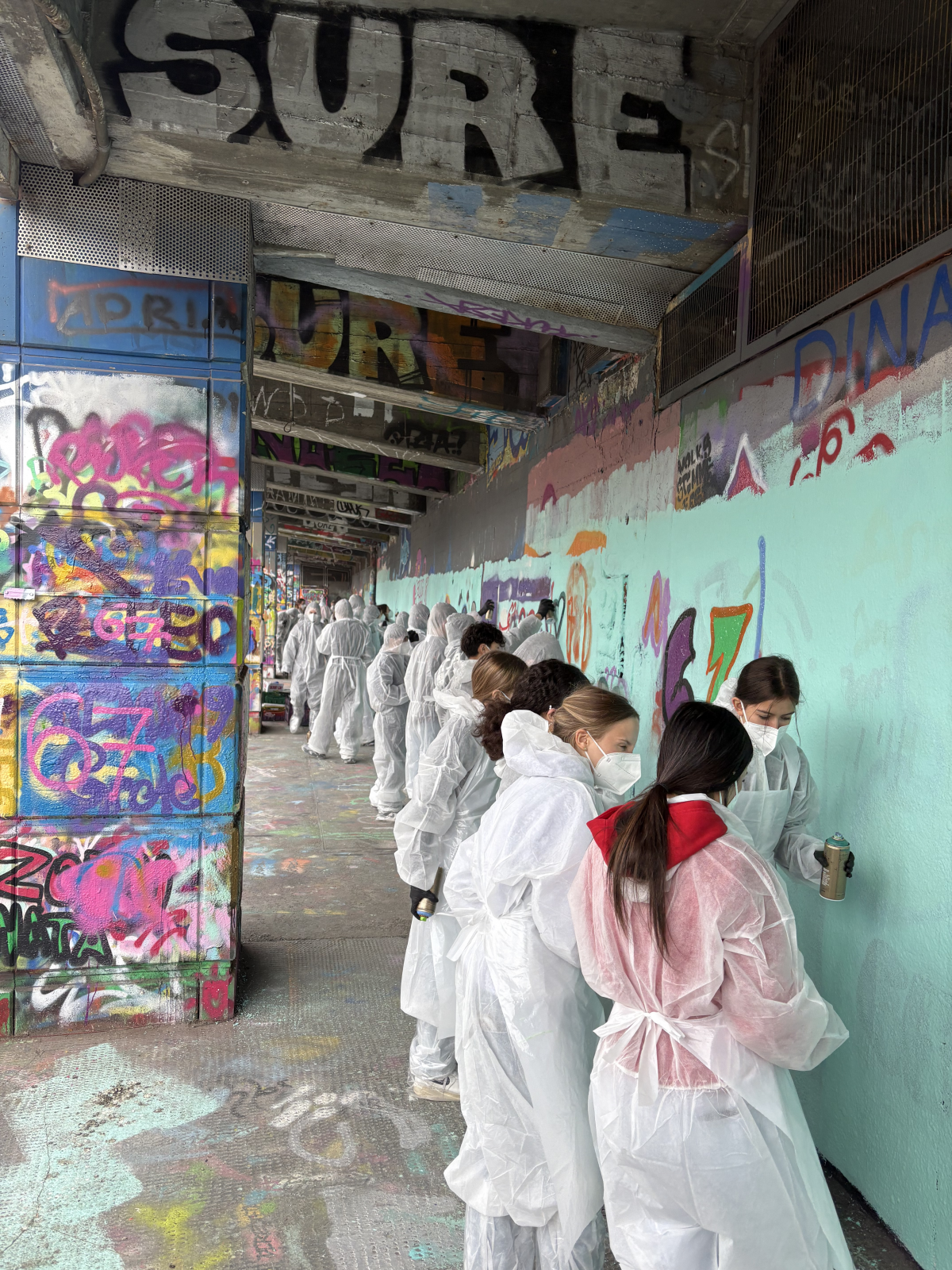 Für besonders gute Stimmung sorgten die Ganzkörperanzüge, die alle trugen, um sich vor Farbflecken zu schützen. „Wir sahen alle gleich aus – das war irgendwie lustig und hat uns zusammengeschweißt“, erzählte ein Schüler. Viele merkten, wie stark das gemeinsame Arbeiten und Gestalten die Klassengemeinschaft fördert: „Wir mussten uns absprechen, wer was macht“.
