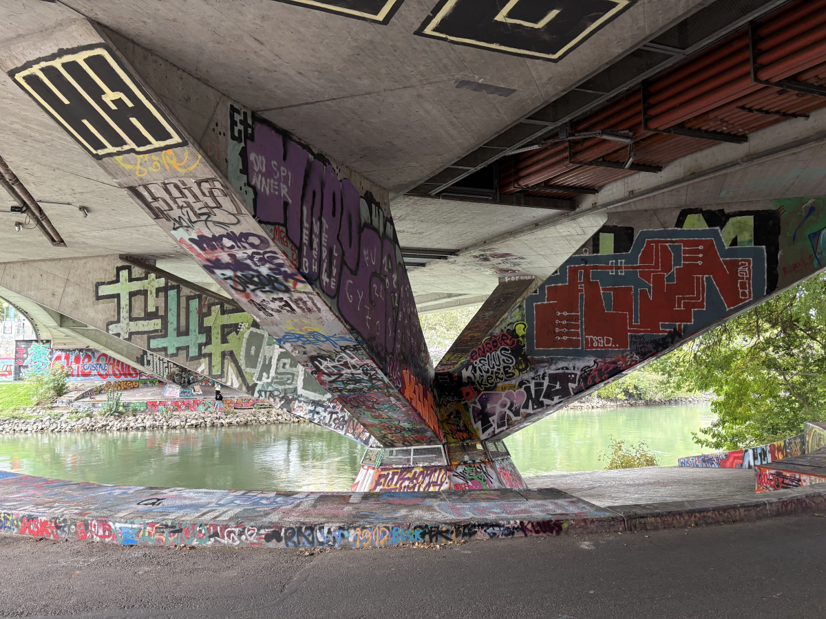 Der Kennenlerntag startete mit einem Spaziergang durch den 9. Bezirk. Über die Strudlhofstiege ging es hinunter, weiter zum Liechtensteinpark, wo am Spielplatz Zeit blieb, um sich auszutauschen und gemeinsam zu lachen. Nach einem kurzen Snack führte der Weg weiter zu den Schwimmenden Gärten am Donaukanal, genauer gesagt zur Wiener Wand - dem Ort, an dem das Highlight des Tages wartete: ein Graffiti-Workshop mit Wolfgang Hold aka May Trasher von Outline.