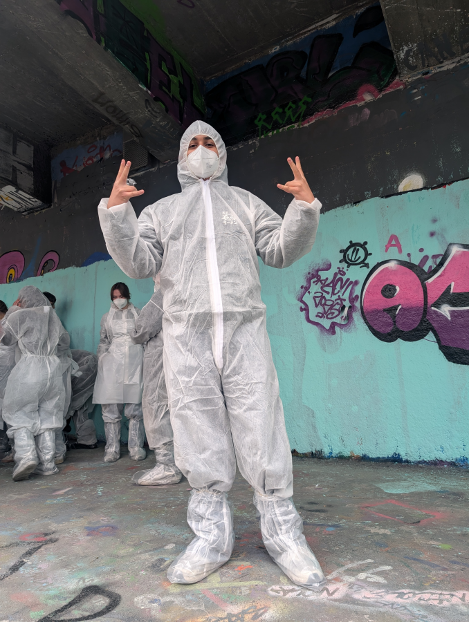 In Kleingruppen entstanden kreative Werke – von bunten Blumensträußen über Schriftzeichen in Mandarin bis hin zu einem Sonnensystem. „Wir hatten zuerst keine Idee, was wir malen sollten, aber am Ende sah es richtig gut aus“, meinte eine Gruppe lachend. Und obwohl das Sprühen gar nicht so einfach war, denn „man muss wissen, wie nah man mit der Dose an die Wand darf, sonst verläuft alles“, waren am Ende alle stolz auf ihre Ergebnisse.